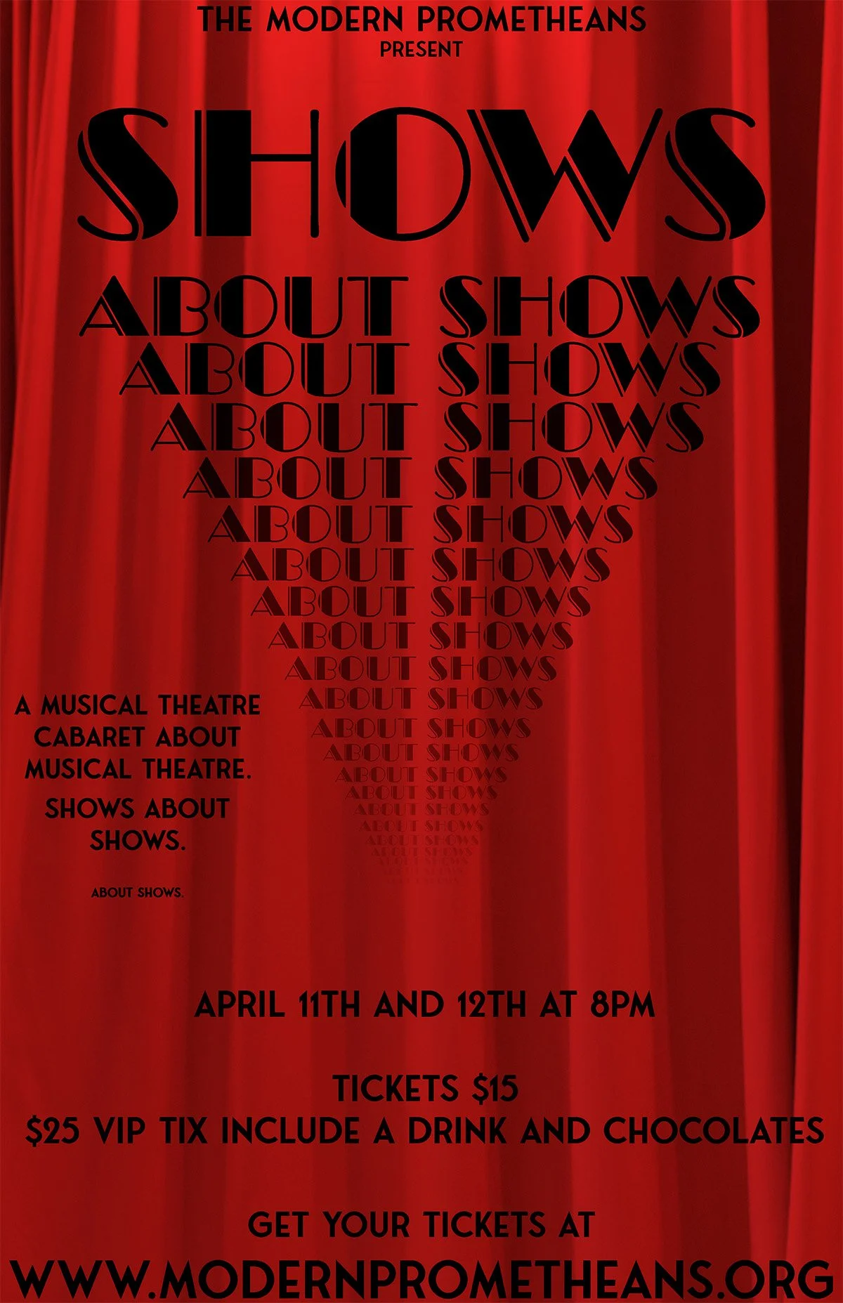The Modern Prometheans present Shows About Shows. A musical theatre cabaret about musical theatre. Don’t miss this cabaret featuring incredible voices and unforgettable performances, with songs from timeless classics and modern hits.