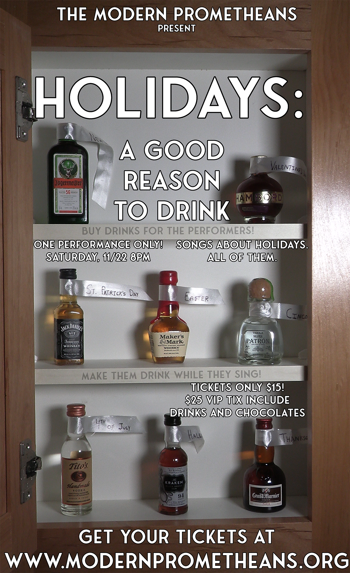 The Modern Prometheans present “Holidays: A Good Reason to Drink” A drunken cabaret featuring songs about holidays. All of them. Don't miss this one-night performance featuring incredible voices and unforgettable performances, with songs from timeless classics and modern hits.